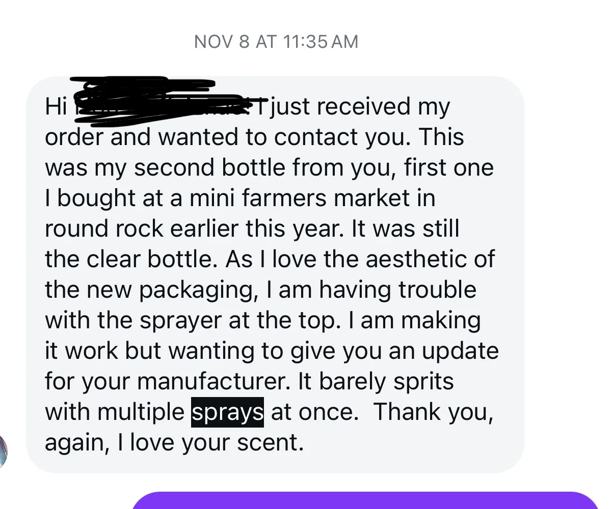 Then I started getting returned products because the sprayers they sent with the bottles either did not work or if it worked, it was very weak. I Told them about it and they proceeded to tell me I was not pressing down on the sprayers well. As if the people who returned their products also did not use it well.